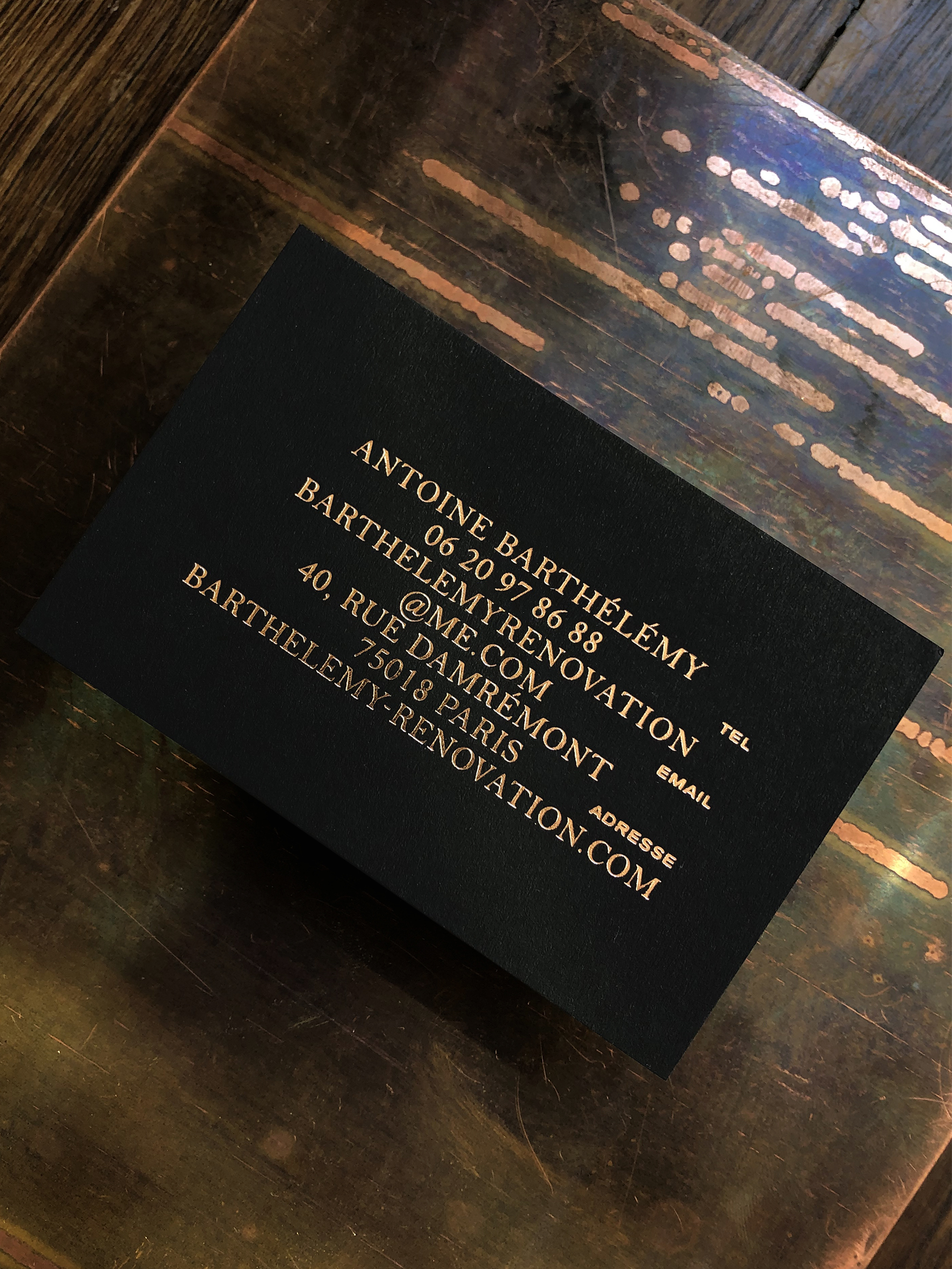 Même les cartes de visite sont restées noires. Certes, le blanc a laissé place à un beau cuivré, savamment imprimé par l’atelier à dorer Ex-anima.